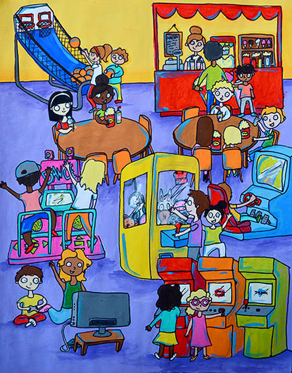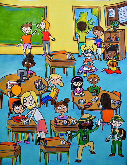 Leblanc, M. (2018). Dans la classe [Acrylique sur papier et feutre permanent noir, 8,5 x 11 po, détails].